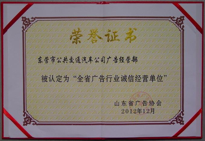 近日,市公交公司廣告部獲山東省廣告協(xié)會(huì)頒發(fā)的2012年度“全省廣告行業(yè)誠(chéng)信經(jīng)營(yíng)單位”證書(shū),成為我市獲此殊榮的四家單位之一。
