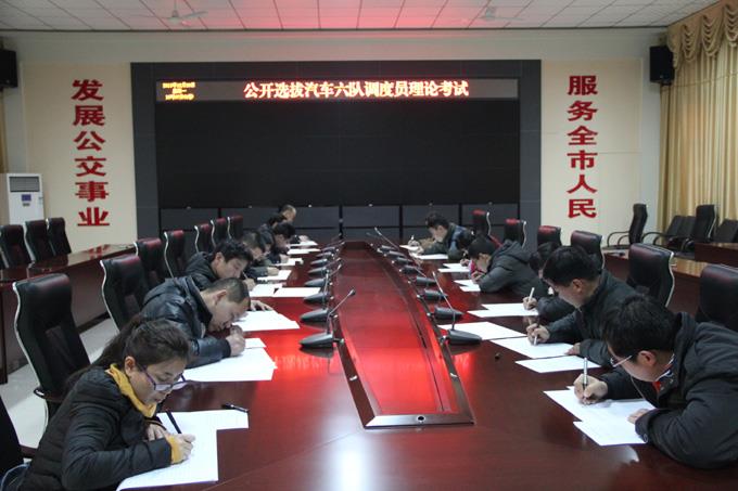 2013年12月底,市公交公司汽車六隊(duì)3名調(diào)度員公開選拔理論考試在公司一樓會(huì)議室開考,符合申報(bào)條件的15名員工,在規(guī)定時(shí)間內(nèi)按照給定的5個(gè)題目,圍繞調(diào)度職責(zé)、如何做好運(yùn)營調(diào)度工作等相關(guān)內(nèi)容進(jìn)行了認(rèn)真答卷。本著公開、公正的原則,由公司領(lǐng)導(dǎo)班子、人事科長、所在車隊(duì)負(fù)責(zé)人組成的評(píng)委對(duì)密封試卷現(xiàn)場評(píng)分后,對(duì)理論成績排名前6名的同志當(dāng)場進(jìn)行了民主評(píng)議。最后,張東衛(wèi)、張光輝、潘志紅3名同志理論成績、民主評(píng)議綜合得分排名居前三位。經(jīng)過3天公示無異議后,3名同志已于2014年1月3日到崗培訓(xùn)。